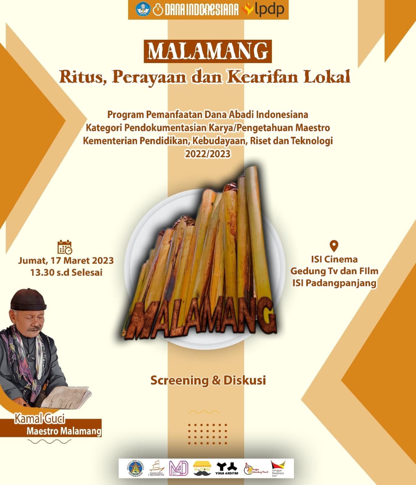Pendokumentasian Pengetahuan Maestro tradisi malamang, sesuai dengan tema yang telah ditetapkan yakni “Kearifan Lokal (Sandang, Pangan dan Papan) untuk Kekinian dan Masa Depan” maka saya meyakini tradisi malamang yang erat kaitannya dengan tradisi yang menghasilkan pangan bagi masyarakat Padang Pariaman yakni lamang yang merupakan kearifan lokal masyarakat Padang Pariaman serta maestro tradisi malamang (Kamal Guci) sangat relevan untuk didokumentasikan pengetahuannya. Kegiatan yang dilaksanakan dalam program ini adalah pendokumentasian, pencatatan pengetahuan tradisi malamang yang saya beri judul Dokuementer Tradisi Malamang “Ritus dan Perayaan Sebagai Kearifan Lokal Masyarakat Padang Pariaman”