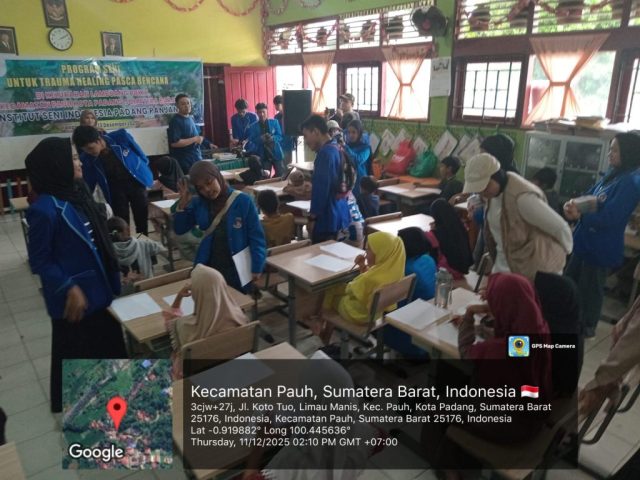 Institut Seni Indonesia (ISI) Padangpanjang melakukan trauma healing terhadap masyarakat yang tengah memulihkan diri pascabencana banjir dan longsor yang melanda berbagai daerah di Sumatera Barat. Melalui gerakan terpadu tim relawan mahasiswa bersama para dosen pembimbing, ISI Padangpanjang melaksanakan program trauma healing dan penyaluran bantuan di tujuh titik terdampak: Tanjung Mutiara (Tanah Datar), Salareh Air (Palembayan), Lambuang Bukik (Kota Padang), Saniang Baka (Solok), Paninggahan (Solok), Selayo (Kota Solok), serta tiga jorong di Nagari Tigo Koto Silungkang, Kabupaten Agam.
