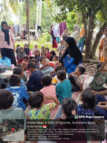 Di Salareh Air, Kecamatan Palembayan, tim relawan bersama pembimbing Awerman, S.Sn., M.Hum., Ph.D., menyalurkan bantuan berupa tas dan perlengkapan alat tulis sebagai dukungan awal untuk memulihkan semangat belajar anak-anak yang terdampak banjir. Selain pembagian bantuan, tim juga menghadirkan hiburan sederhana seperti sesi mendongeng, bercerita, dan permainan tebak-tebakan. Aktivitas ini menjadi ruang ceria bagi anak-anak untuk mengurangi ketegangan sekaligus memperkuat kembali motivasi mereka untuk kembali belajar.
