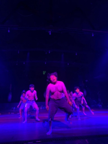 Pertunjukan dimulai dengan bunyi suara burung dan alam yang digarap secara digital, menciptakan nuansa pedalaman yang kental. Kemudian, sejumlah individu memasuki panggung dengan bergerombolan, dengan tubuh mereka dihiasi tato berbagai bentuk. Di kaki musisi-musisi tersebut, tergantung ganto kecil yang menghasilkan suara gemerincing ketika diayunkan dengan hentakan yang khas. Selain itu, tiga buah gong yang tergantung di atas panggung tidak hanya berfungsi sebagai elemen artistik dalam pertunjukan, tetapi juga dimainkan dengan pukulan dan aksentuasi oleh tiga penabuh yang terampil.